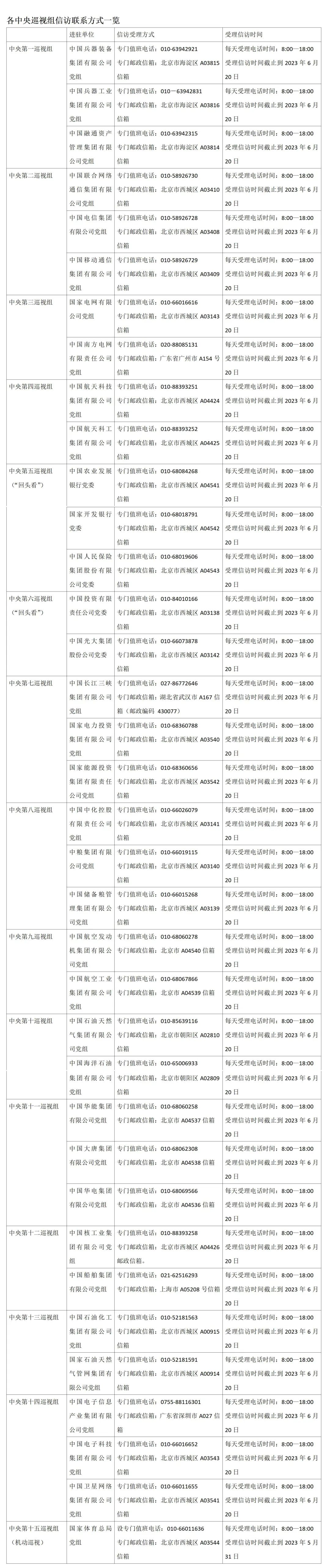 其中,常规巡视和“回头看”工作时间为两个半月左右,受理信访时间截止到2023年6月20日;机动巡视工作时间为一个半月左右,受理信访时间截止到2023年5月31日。