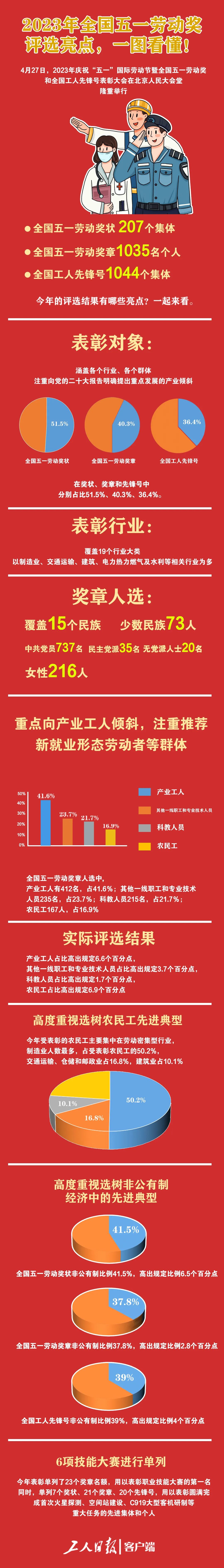 4月27日,2023年庆祝“五一”国际劳动节暨全国五一劳动奖和全国工人先锋号表彰大会在北京人民大会堂隆重举行。207个集体和1035名个人分获全国五一劳动奖状、奖章,1044个集体获全国工人先锋号。