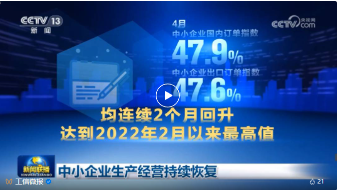 工业和信息化部对5.1万户中小企业问卷调查显示,4月,35.0%的中小企业认为生产经营状态较好,连续2个月回升,51.2%的中小企业表示有招工需求,同时,订单量明显回暖。4月,中小企业国内订单、出口订单指数分别为47.9%、47.6%,均连续2个月回升,达到2022年2月以来最高值。位于成都高新区的这家制造企业在加紧赶制订单的同时,还计划拓宽国际市场。