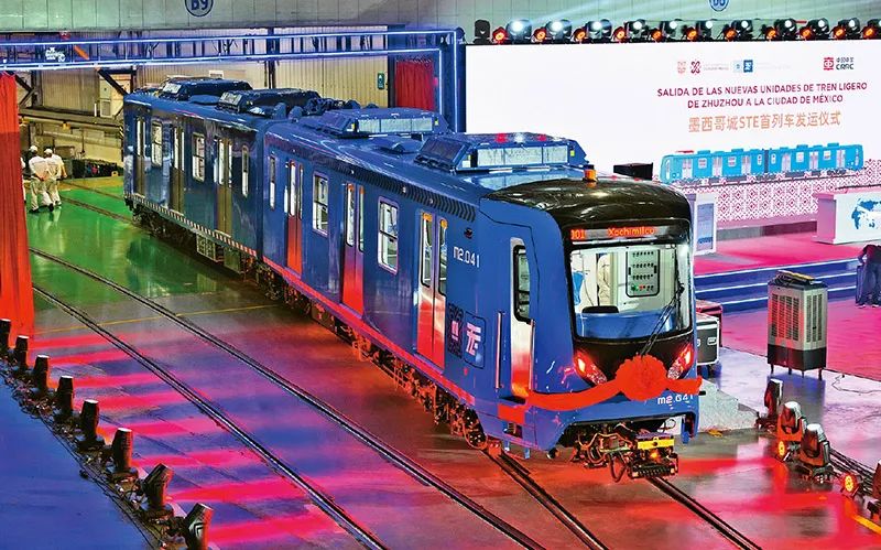 2023年9月9日,中国中车为墨西哥首都墨西哥城定制的铰接式轻轨列车首列车在中车株洲电力机车有限公司下线。为满足墨西哥城城区蜿蜒曲折的线路条件和大客流出行需求,该项目采用具有完全知识产权的铰接式转向架的轻轨列车,列车具有编组灵活、安全舒适等特点。 新华社记者 陈泽国/摄