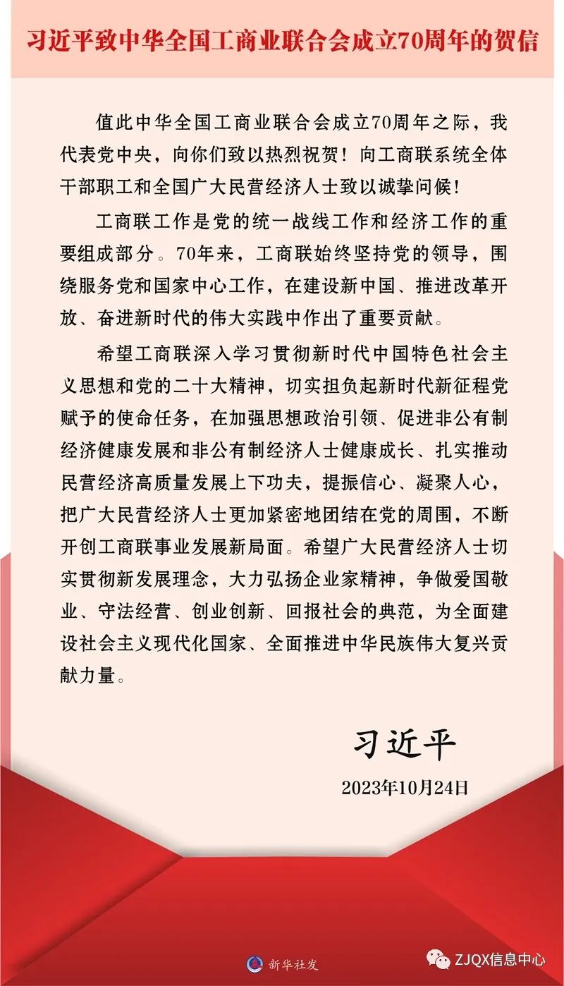 新华社北京10月24日电 在中华全国工商业联合会成立70周年之际,中共中央总书记、国家主席、中央军委主席习近平发来贺信,代表党中央致以热烈祝贺,向工商联系统全体干部职工和全国广大民营经济人士致以诚挚问候。