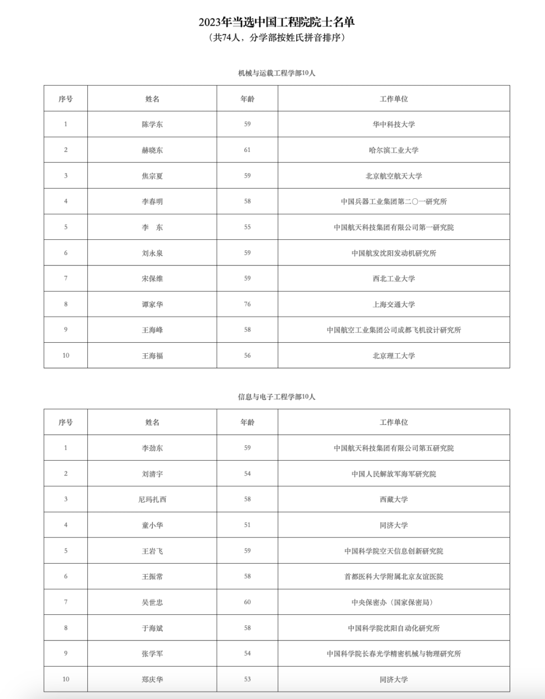 关于公布中国工程院2023年院士增选当选院士名单的公告