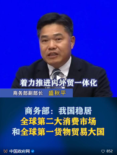 加快内外贸一体化发展是构建新发展格局、推动高质量发展的内在要求。近年来,商务部会同各有关部门、各地区认真贯彻落实党中央、国务院决策部署,着力推进内外贸一体化取得积极进展,内外贸规模质量进一步提升。2023年1—11月,我国社会消费品零售总额42.8万亿元,同比增长7.2%,货物进出口总额38万亿元,同比持平,稳居全球第二大消费市场和全球第一货物贸易大国地位。