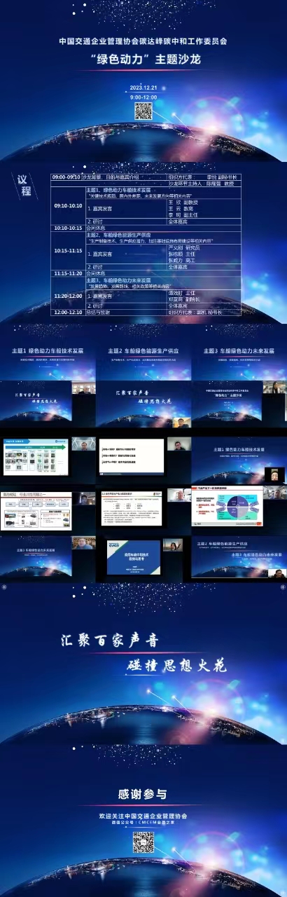 12月21日,中国交通企业管理协会碳达峰碳中和工作委员会(以下简称中交企协双碳工委)“绿色动力”主题沙龙成功举办,沙龙围绕绿色动力车船技术、绿色能源生产供应、车船绿色动力相关政策与未来发展等专题进行了充分的交流与研讨。中交企协双碳工委秘书长郭凯、干事王静静、四川大学副研究员徐海迪及10余位嘉宾参与沙龙,中交企协双碳工委会员单位代表、四川大学教授陈耀强,中交企协双碳工委副秘书长、交通运输部规划研究院(交通排放控制监测技术实验室)所总工李悦主持沙龙。