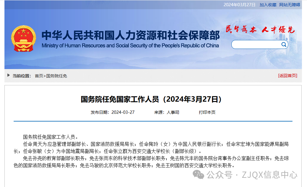 人事任免|应急管理部、国家消防救援局、中国人民银行、国家能源局、中国地震局、西安交通大学一览表