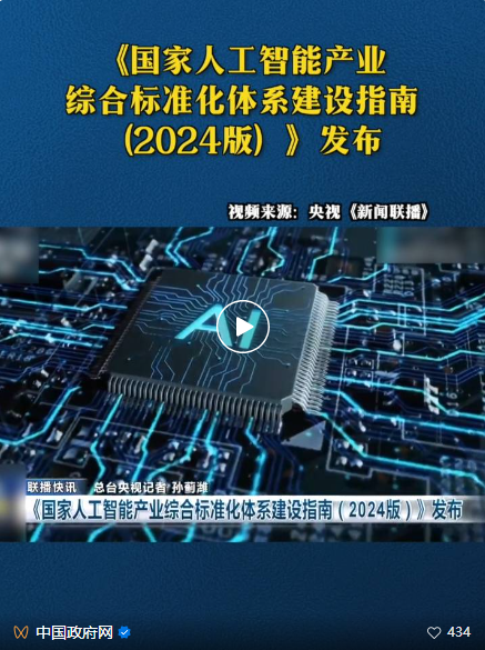 ● 工业和信息化部、中央网信办、国家发展改革委、国家标准委等四部门近日联合印发《国家人工智能产业综合标准化体系建设指南(2024版)》。