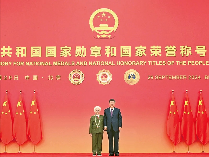 2024年9月29日,中华人民共和国国家勋章和国家荣誉称号颁授仪式在北京人民大会堂金色大厅隆重举行。中共中央总书记、国家主席、中央军委主席习近平向“人民艺术家”国家荣誉称号获得者田华颁授奖章。新华社记者 谢环驰/摄