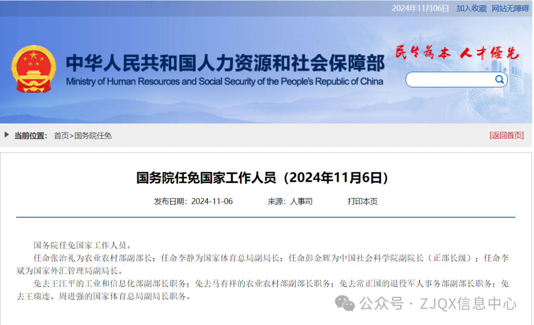 人事任免|张治礼任农业农村部副部长、李静任国家体育总局副局长、彭金辉任中国社会科学院副院长、李斌任国家外汇管理局副局长
