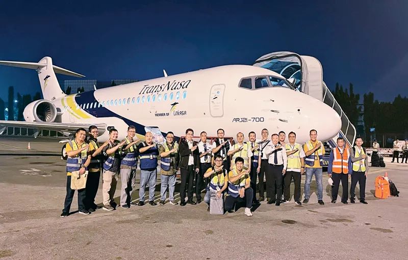 2024年5月31日傍晚,中国飞机租赁集团向印度尼西亚翎亚航空交付的第三架国产喷气式ARJ21飞机抵达印尼首都雅加达。这是国产飞机的首单人民币跨境结算交易。图为抵达当日,工作人员在国产喷气式ARJ21飞机前合影。新华社发 印尼翎亚航空供图