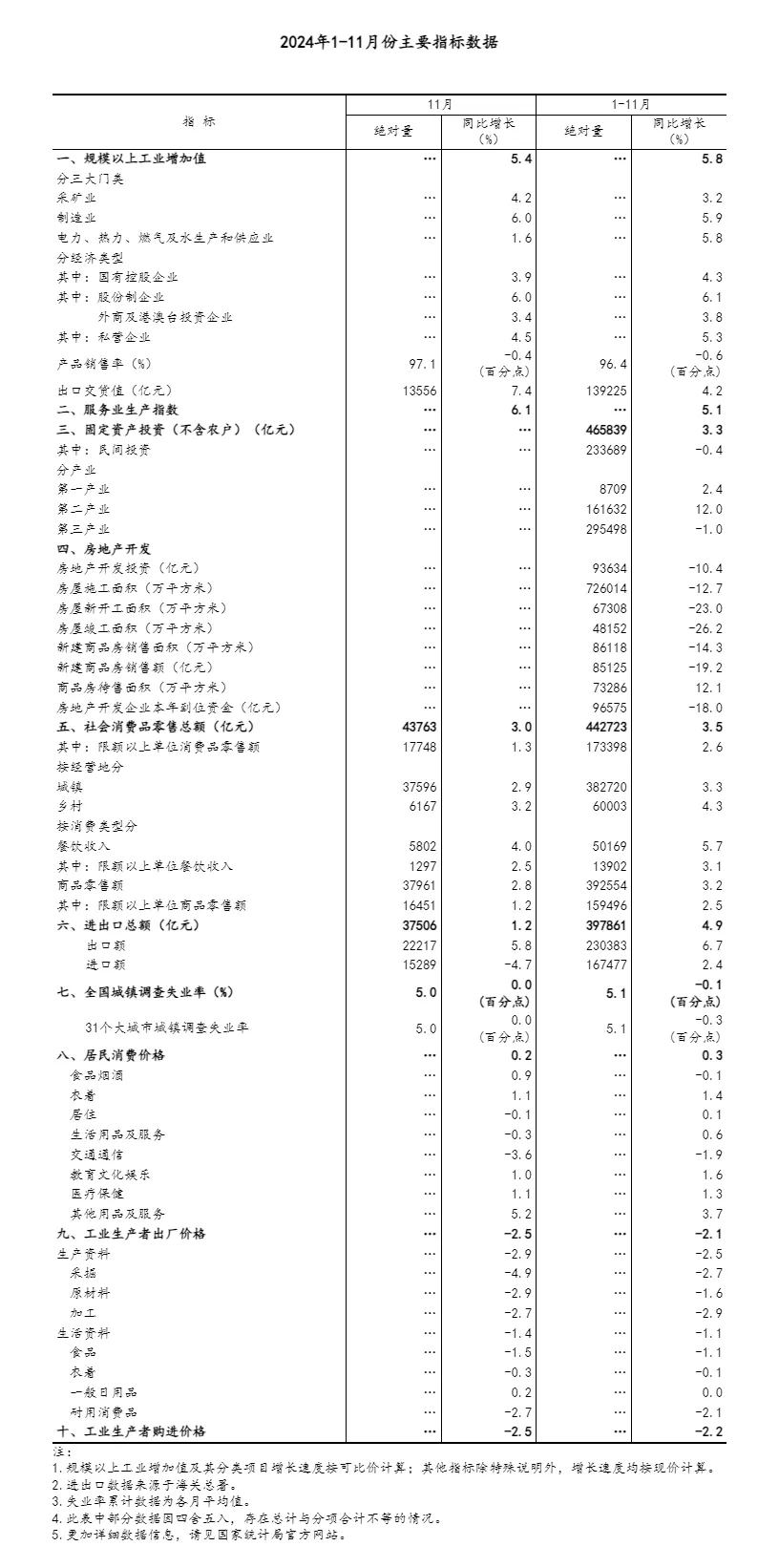 总的来看,11月份,存量政策和增量政策组合效应继续释放,国民经济运行总体平稳、稳中有进,积极变化进一步增多。但也要看到,外部环境更加错综复杂,国内需求不足,部分企业生产经营困难,经济持续回升向好基础仍待巩固。下阶段,要坚持以习近平新时代中国特色社会主义思想为指导,全面贯彻落实中央经济工作会议精神,坚持稳中求进工作总基调,完整准确全面贯彻新发展理念,加快构建新发展格局,扎实推进高质量发展,进一步全面深化改革,扩大高水平对外开放,扩大国内需求,稳定预期、激发活力,推动经济持续回升向好,确保全年经济社会发展主要目标任务顺利实现。