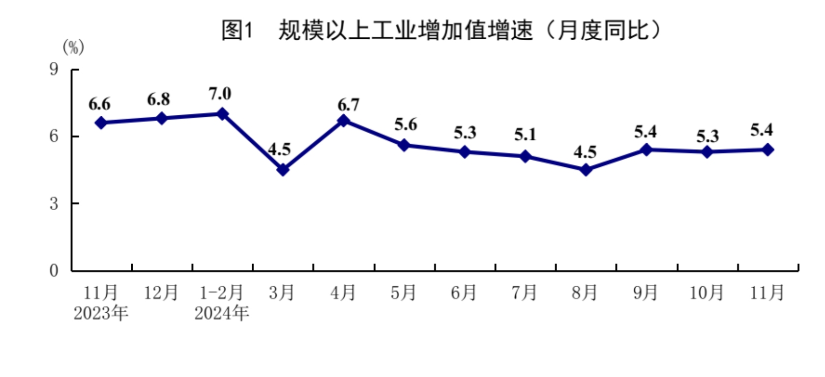 11月份,全国规模以上工业增加值同比增长5.4%,比上月加快0.1个百分点;环比增长0.46%。分三大门类看,采矿业增加值同比增长4.2%,制造业增长6.0%,电力、热力、燃气及水生产和供应业增长1.6%。装备制造业增加值同比增长7.6%,比上月加快1.0个百分点;高技术制造业增加值增长7.8%,快于全部规模以上工业增加值2.4个百分点。分经济类型看,国有控股企业增加值同比增长3.9%;股份制企业增长6.0%,外商及港澳台投资企业增长3.4%;私营企业增长4.5%。分产品看,新能源汽车、工业机器人、集成电路产品产量同比分别增长51.1%、29.3%、8.7%。1-11月份,全国规模以上工业增加值同比增长5.8%。11月份,制造业采购经理指数为50.3%,比上月上升0.2个百分点;企业生产经营活动预期指数为54.7%,上升0.7个百分点。1-10月份,全国规模以上工业企业实现利润总额58680亿元,同比下降4.3%。