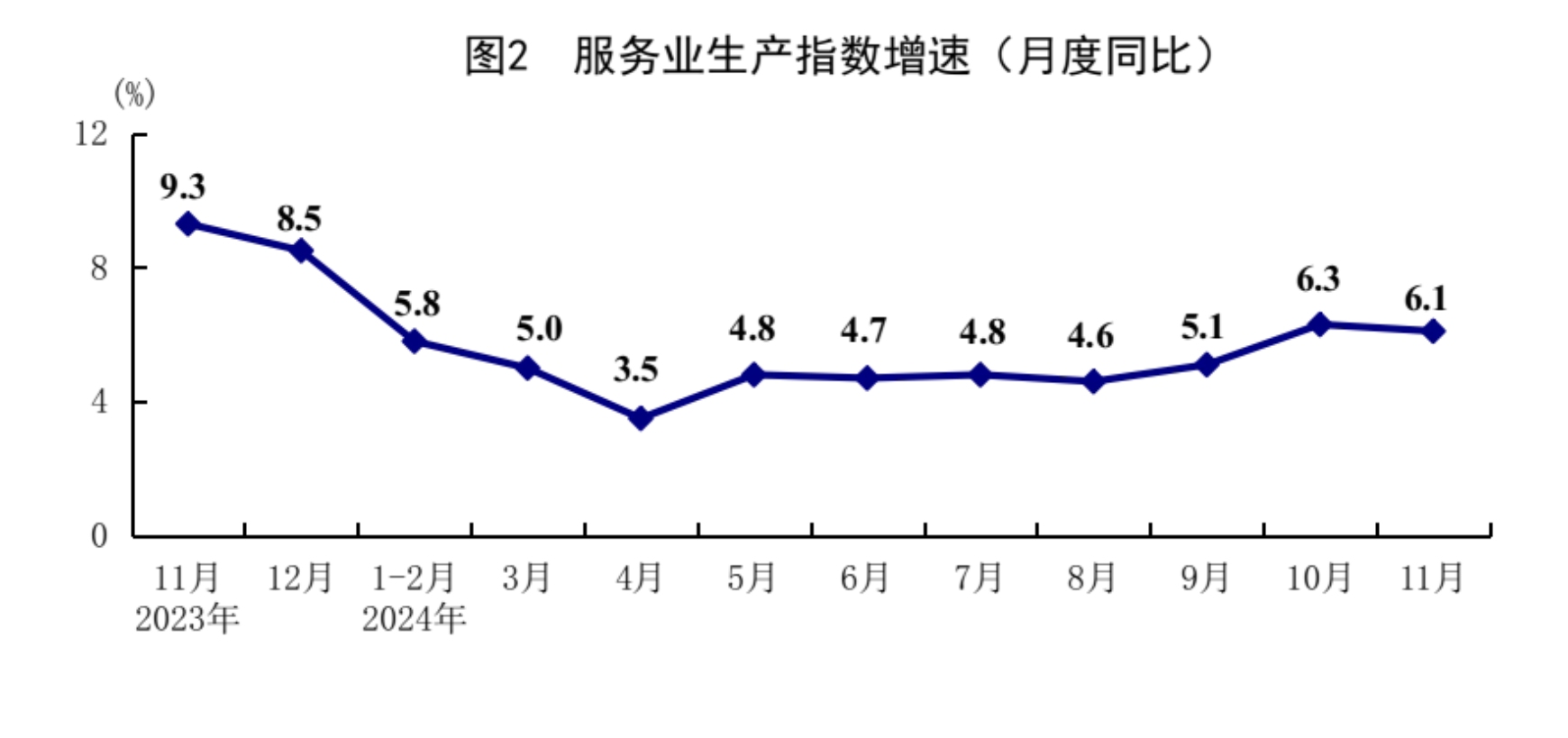 11月份,全国服务业生产指数同比增长6.1%。分行业看,信息传输、软件和信息技术服务业,租赁和商务服务业,金融业生产指数同比分别增长9.3%、9.3%、8.8%,分别快于服务业生产指数3.2、3.2、2.7个百分点;房地产业,交通运输、仓储和邮政业生产指数分别增长2.9%、6.0%,分别比上月加快2.1、1.3个百分点。1-11月份,全国服务业生产指数同比增长5.1%。1-10月份,规模以上服务业企业营业收入同比增长7.4%。11月份,服务业商务活动指数为50.1%,与上月持平;服务业业务活动预期指数为57.3%,比上月上升1.1个百分点。其中,电信广播电视及卫星传输服务、互联网软件及信息技术服务、货币金融服务、资本市场服务、保险等行业商务活动指数位于55.0%以上较高景气区间。