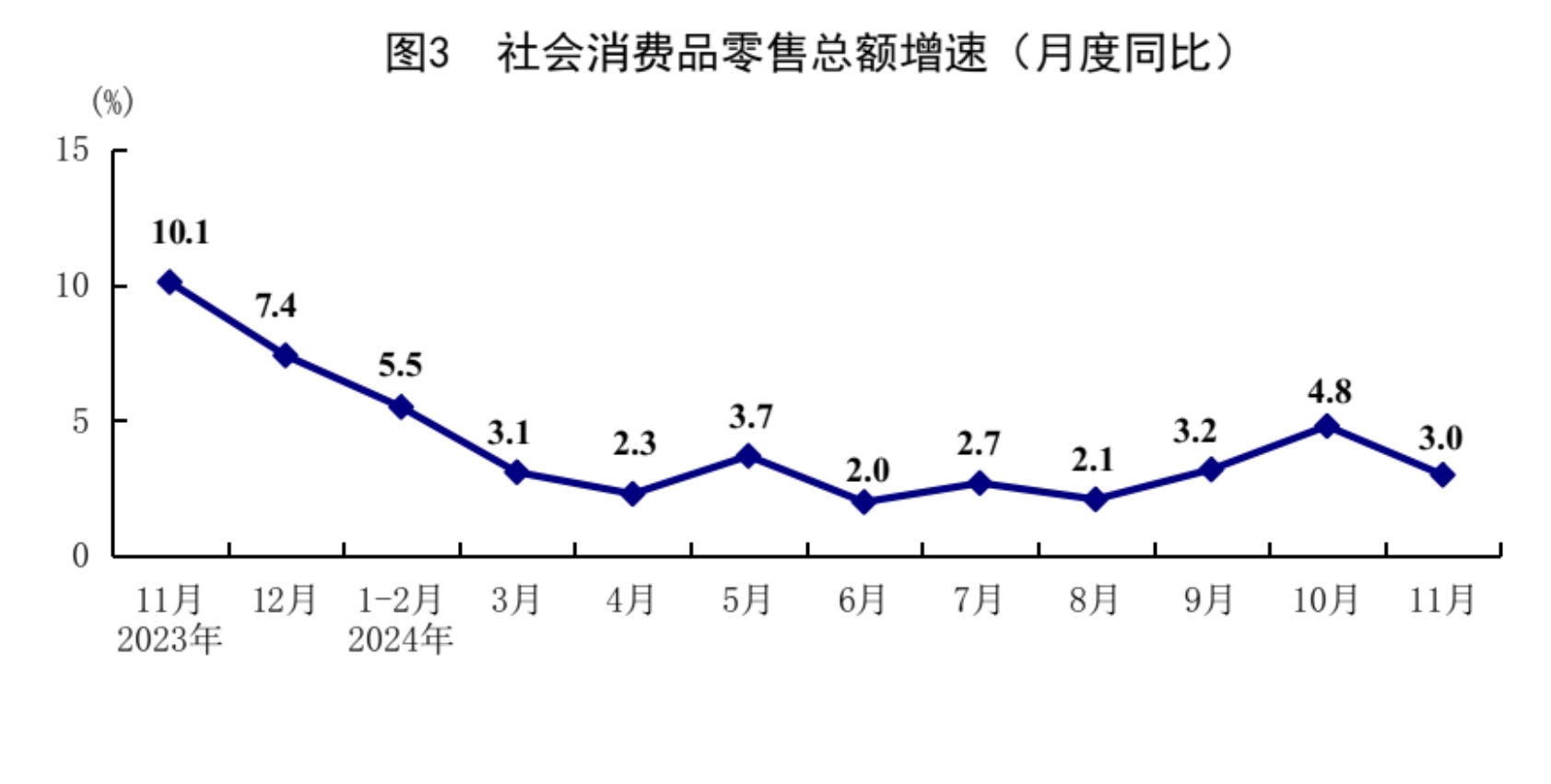 11月份,社会消费品零售总额43763亿元,同比增长3.0%;环比增长0.16%。按经营单位所在地分,城镇消费品零售额37596亿元,同比增长2.9%;乡村消费品零售额6167亿元,增长3.2%。按消费类型分,商品零售额37961亿元,增长2.8%;餐饮收入5802亿元,增长4.0%。消费品以旧换新政策持续显效,限额以上单位家用电器和音像器材类、家具类、汽车类、建筑及装潢材料类商品零售额分别增长22.2%、10.5%、6.6%、2.9%。1-11月份,社会消费品零售总额442723亿元,同比增长3.5%。全国网上零售额140308亿元,同比增长7.4%。其中,实物商品网上零售额118059亿元,增长6.8%,占社会消费品零售总额的比重为26.7%。1-11月份,服务零售额同比增长6.4%。
