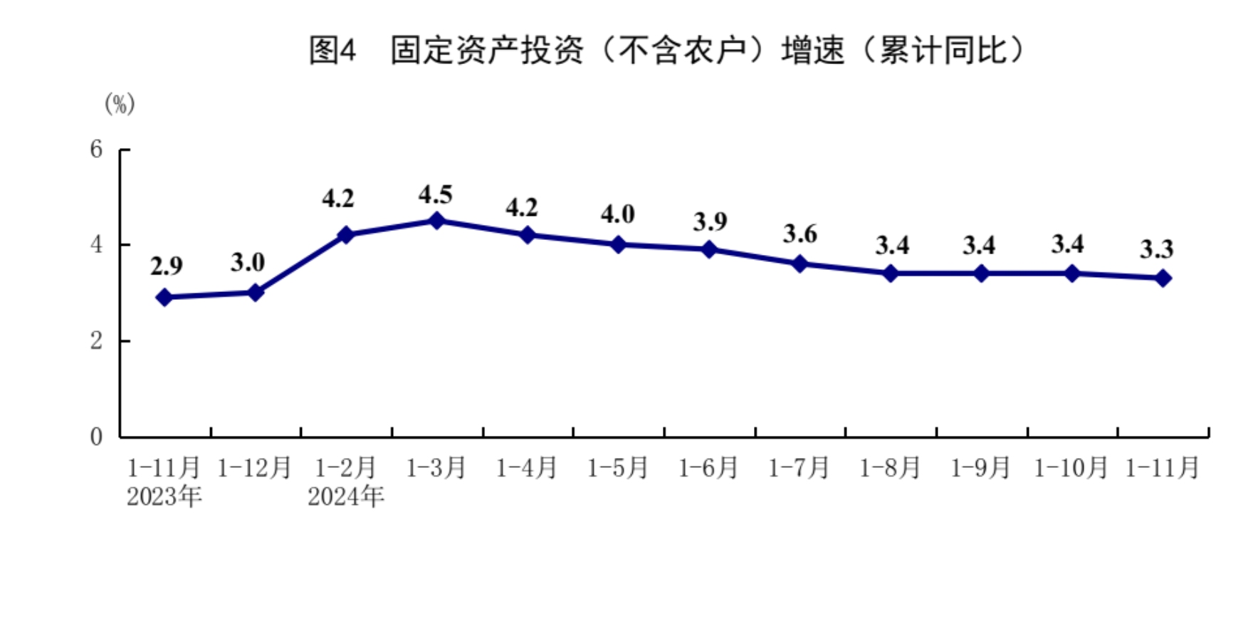 1-11月份,全国固定资产投资(不含农户)465839亿元,同比增长3.3%;扣除房地产开发投资,全国固定资产投资增长7.4%。分领域看,基础设施投资同比增长4.2%,制造业投资增长9.3%,房地产开发投资下降10.4%。全国新建商品房销售面积86118万平方米,同比下降14.3%,降幅比1-10月份收窄1.5个百分点;新建商品房销售额85125亿元,下降19.2%,降幅收窄1.7个百分点。分产业看,第一产业投资同比增长2.4%,第二产业投资增长12.0%,第三产业投资下降1.0%。民间投资同比下降0.4%;扣除房地产开发投资,民间投资增长6.2%。高技术产业投资同比增长8.8%,其中高技术制造业和高技术服务业投资分别增长8.2%、10.2%。高技术制造业中,航空、航天器及设备制造业,电子及通信设备制造业投资分别增长35.4%、8.8%;高技术服务业中,专业技术服务业、电子商务服务业投资分别增长27.9%、12.5%。11月份,固定资产投资(不含农户)环比增长0.10%。