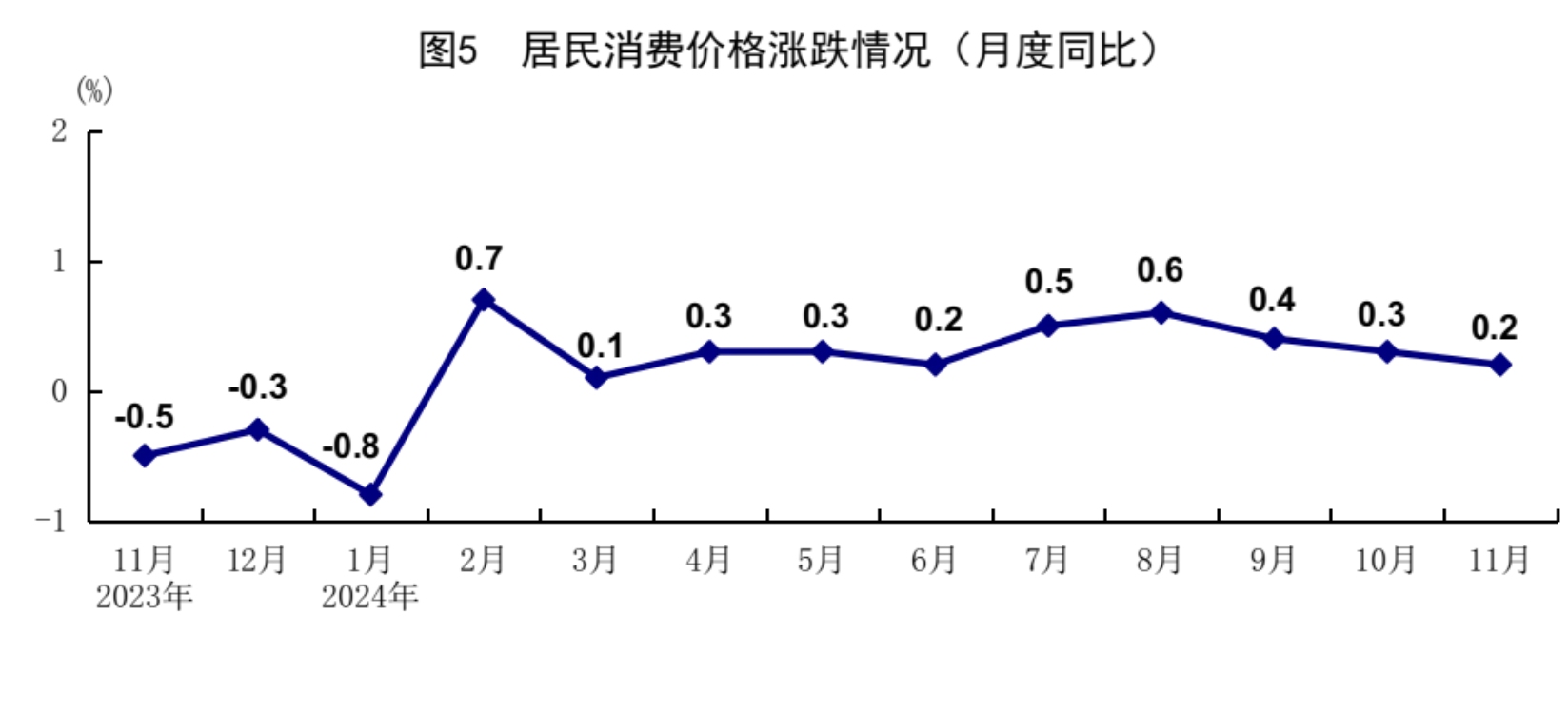 11月份,全国居民消费价格(CPI)同比上涨0.2%;环比下降0.6%。分类别看,食品烟酒价格同比上涨0.9%,衣着价格上涨1.1%,居住价格下降0.1%,生活用品及服务价格下降0.3%,交通通信价格下降3.6%,教育文化娱乐价格上涨1.0%,医疗保健价格上涨1.1%,其他用品及服务价格上涨5.2%。在食品烟酒价格中,粮食价格下降1.1%,鲜果价格下降0.3%,鲜菜价格上涨10.0%,猪肉价格上涨13.7%。扣除食品和能源价格后的核心CPI同比上涨0.3%,涨幅比上月扩大0.1个百分点。1-11月份,全国居民消费价格同比上涨0.3%。