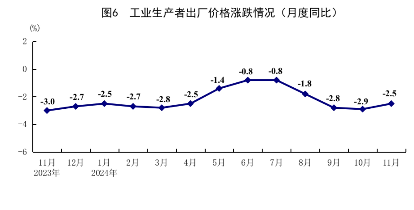 11月份,全国工业生产者出厂价格同比下降2.5%,降幅比上月收窄0.4个百分点;环比上涨0.1%。全国工业生产者购进价格同比下降2.5%,降幅收窄0.2个百分点;环比下降0.1%。1-11月份,全国工业生产者出厂价格和购进价格同比分别下降2.1%和2.2%。