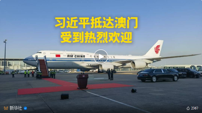 12月18日下午,中共中央总书记、国家主席、中央军委主席习近平乘专机抵达澳门,出席将于20日举行的庆祝澳门回归祖国25周年大会暨澳门特别行政区第六届政府就职典礼,并视察澳门。