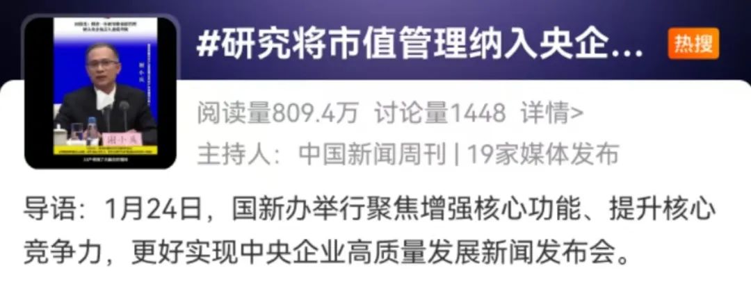 1月24日上午,国务院新闻办公室举行新闻发布会,国务院国资委有关负责同志介绍聚焦增强核心功能、提升核心竞争力、更好实现中央企业高质量发展有关情况并回答记者提问。新闻发布会介绍国务院国资委将进一步研究将市值管理纳入中央企业负责人业绩考核。
