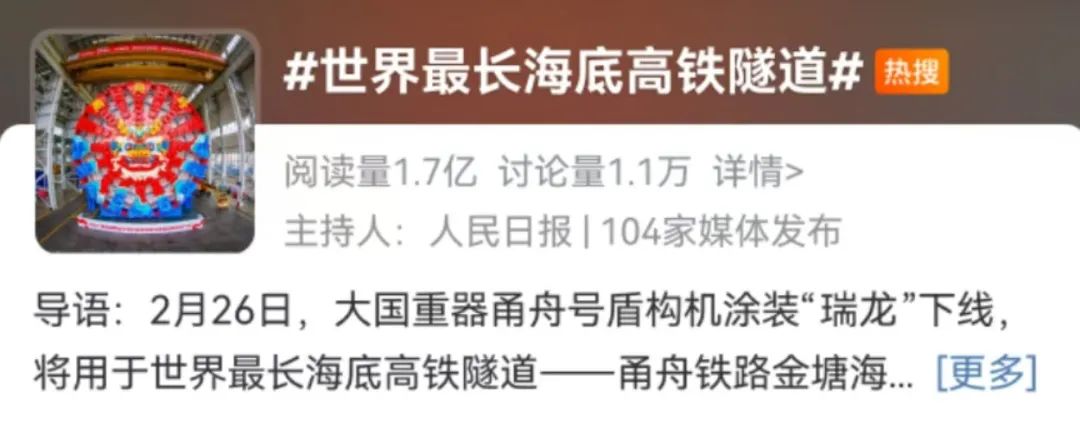 2月26日,由中国铁建研发的大国重器甬舟号盾构机涂装“瑞龙”下线,目前已用于世界最长海底高铁隧道——甬舟铁路金塘海底隧道开挖掘进。盾构机直径14.57米,穿越海底最大埋深78米,要经历14次岩层变换,穿越10万吨航道,最终在海底实现精准对接。施工复杂程度和风险都是世界级难度。甬舟铁路全长77公里,项目建成后,可实现舟山岛与陆地之间的高铁跨海通行。
