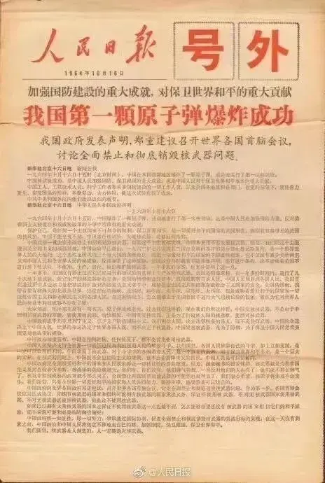 1964年10月16日15时整,在新疆罗布泊荒漠,闪过一道强烈亮光,惊天动地的巨响之后,巨大火球转为蘑菇云冲天而起——浓缩着许多人汗水与智慧结晶的我国第一颗原子弹爆炸成功了!