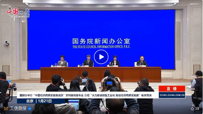 1月21日,国务院新闻办公室举行“中国经济高质量发展成效”系列新闻发布会,介绍“大力推进新型工业化 推动经济高质量发展”情况。工业和信息化部党组成员、副部长张云明,工业和信息化部运行监测协调局局长陶青,工业和信息化部信息通信发展司司长谢存出席发布会,介绍有关情况并答记者问。
