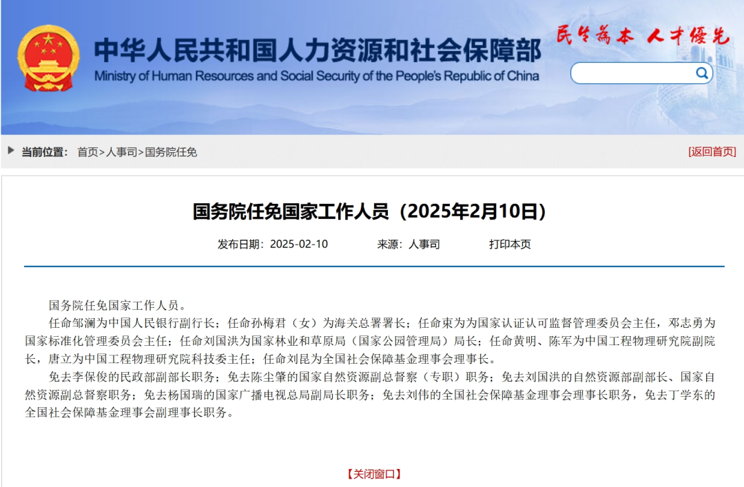 人事任免|中国人民银行、海关总署、国家认证认可监督管理委员会、国家标准化管理委员会、国家林业和草原局(国家公园管理局)等一览表