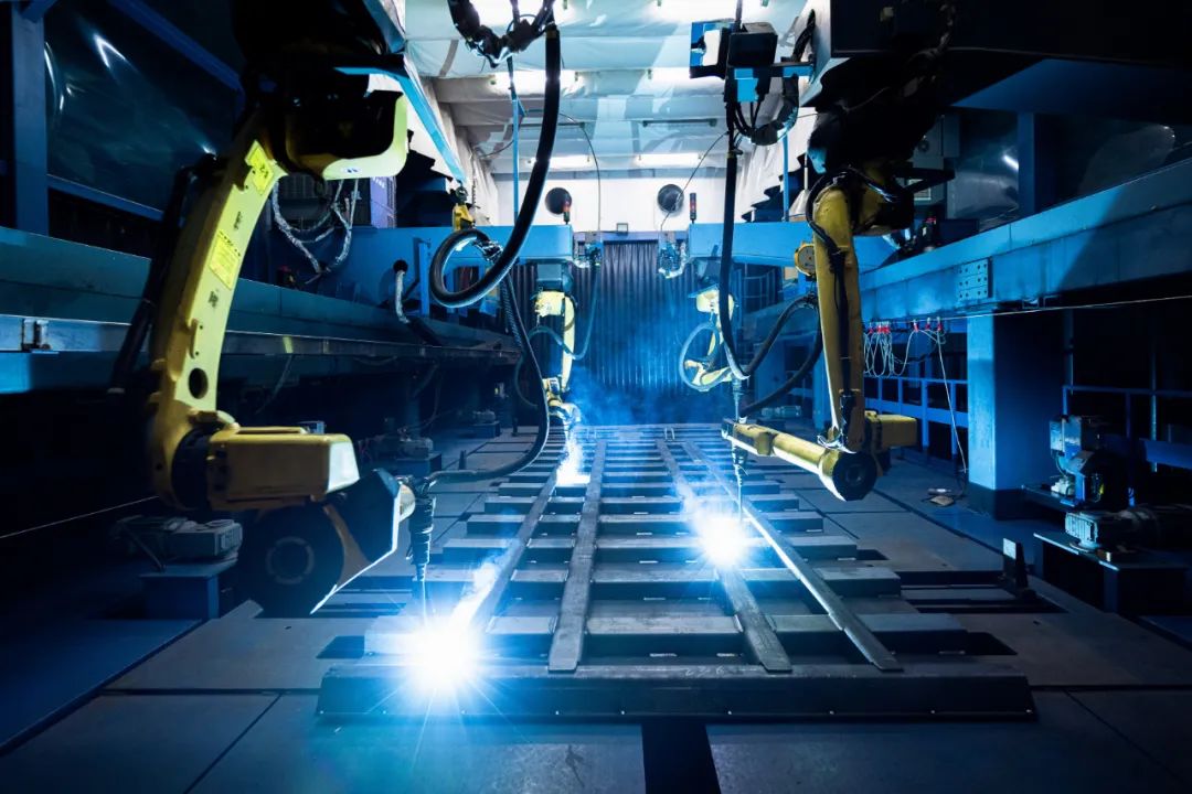 图为2025年2月13日,工业机器人在中国重汽集团湖北华威专用汽车有限公司自卸车智能化生产线上作业。新华社记者 肖艺九/摄