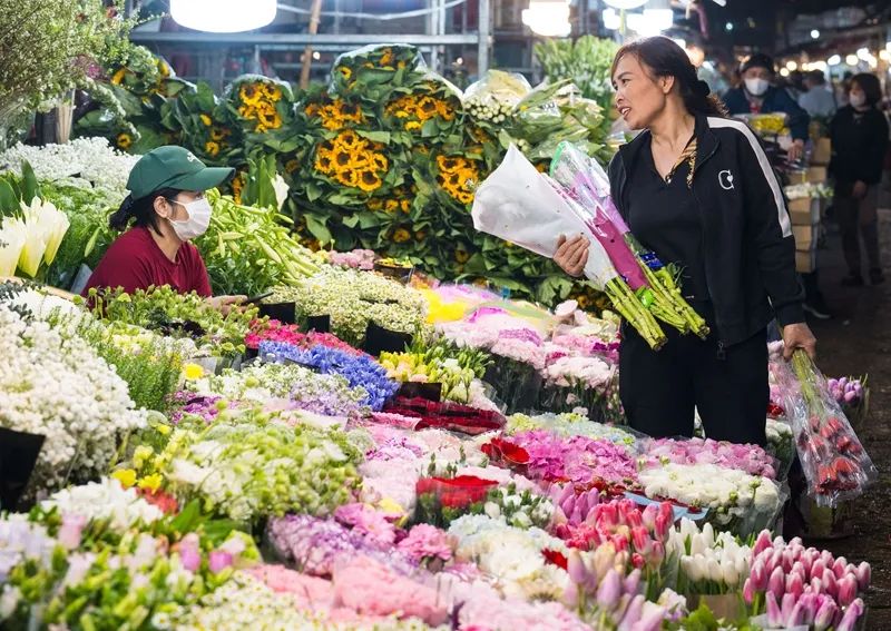 2025年3月28日,一名女子在越南河内广霸花市购买鲜花。新华社记者 朱炜 摄