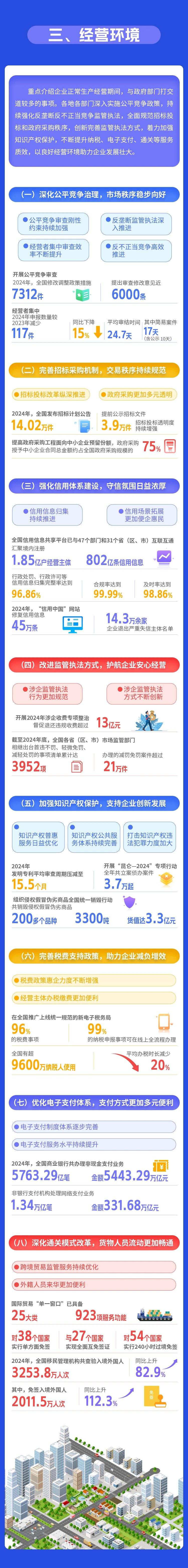 《报告》突出中国特色,展示我国以“高效办成一件事”为牵引提升行政效能和水平的创新实践,具体介绍企业开办、企业信息变更、破产信息核查、企业注销等领域“一件事”实施效果。《报告》紧扣企业关切,以经营主体获得感为导向,聚焦破除准入壁垒、保障公平竞争、规范监管执法、保护知识产权等突出关切,介绍2024年相关领域出台的法律法规或政策文件、贯彻落实的具体举措、取得的实际成效,辅以11个政策专栏、16个地方案例生动呈现改革实施效果。