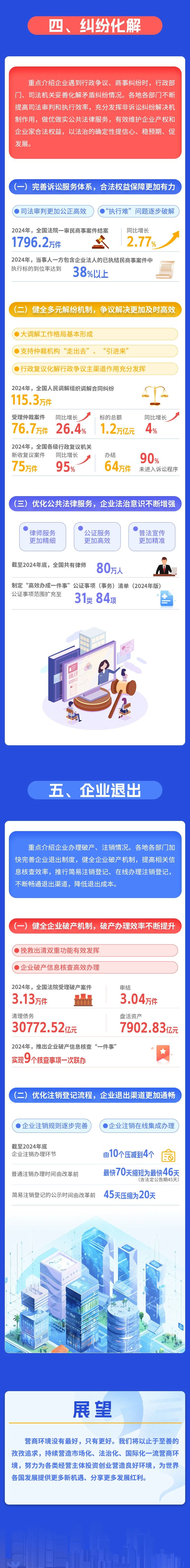 《中国营商环境发展报告(2025)》(以下简称《报告》)按照企业从设立到退出的全生命周期,分5个部分展示2024年全国层面营商环境各领域进展成效。“进入市场”部分,主要介绍破除市场准入壁垒,以及提升企业登记注册、不动产登记、项目审批服务、电水网接入便利度等方面情况。“要素保障”部分,主要介绍保障经营主体获取资金、劳动、技术、数据等生产要素情况。“经营环境”部分,主要介绍深化公平竞争治理、完善招标采购机制、强化信用体系建设、改进监管执法方式、加强知识产权保护、完善税费支持政策、优化电子支付体系、深化通关模式改革等方面情况。“纠纷化解”部分,主要介绍完善诉讼服务体系、健全多元解纷机制、优化公共法律服务等方面情况。“企业退出”部分,重点介绍健全企业破产机制、优化企业注销登记流程等方面情况。