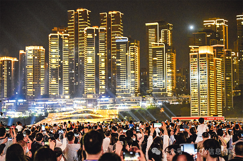 今年一季度,我国居民人均消费支出同比增长5.2%,最终消费支出拉动经济增长2.8个百分点,消费对经济发展的基础性作用进一步巩固。图为2025年5月2日晚,游客在重庆朝天门广场欣赏灯光秀。 新华社记者 王全超/摄