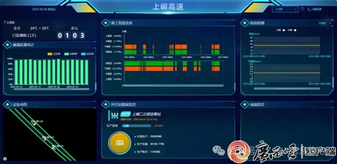 这套路面施工质量智慧化管控平台融合了物联网、北斗定位、5G传输、云计算、大数据分析等系统,可以实现拌合站生产、混合料运输、现场摊铺碾压的全过程远程管控,形成“实时监测、智能预警、精准纠偏”的闭环管理。自应用以来,路面平整度提升33%,施工效率提升30%。