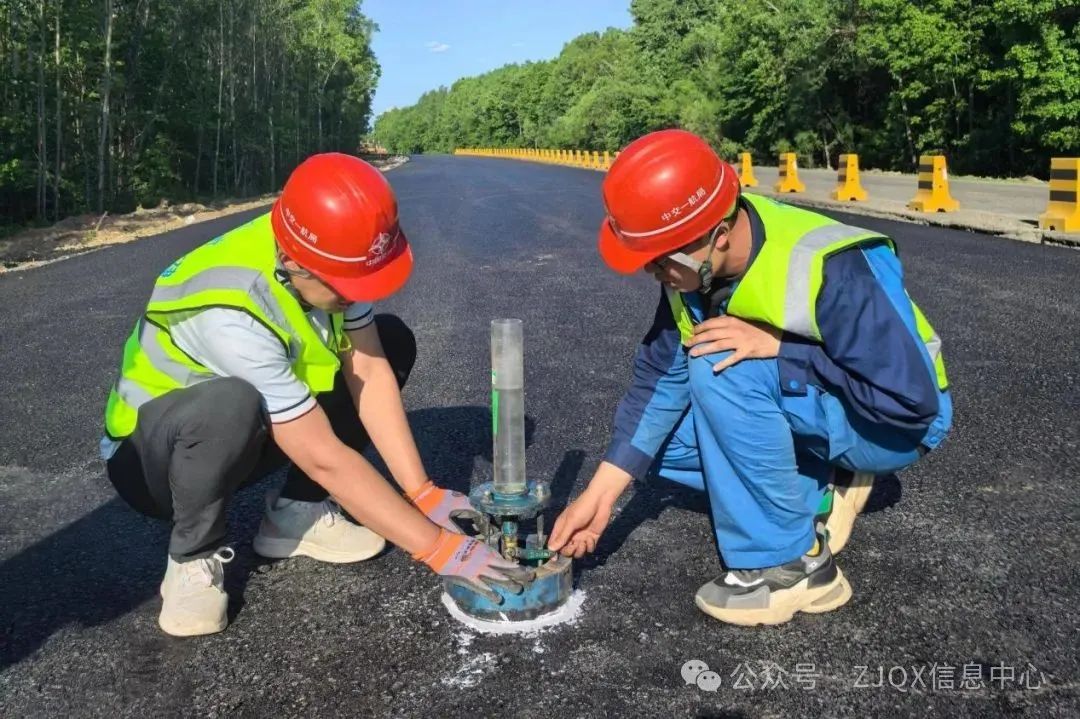 施工期间,项目负责人24小时现场值班,技术人员全过程旁站监督,不分昼夜对摊铺机摊铺速度、压路机碾压遍数、沥青混合料温度进行严格把控,并及时对路面压实度、厚度、平整度、级配、沥青含量、渗水系数等关键技术指标进行全面检测,确保沥青施工质量。