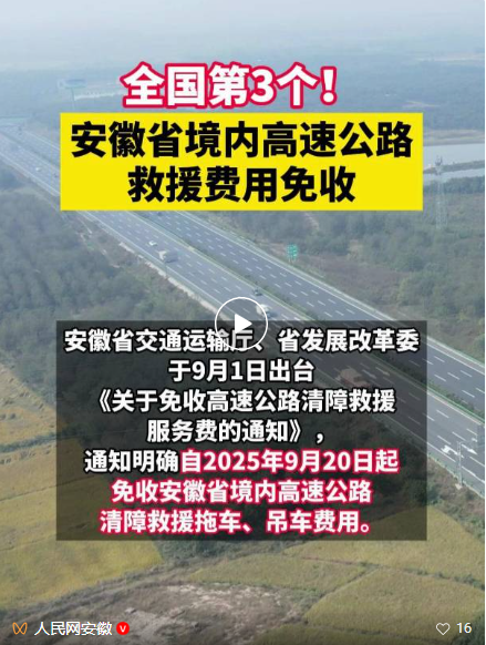 为进一步提升高速路网保通保畅能力,促进长三角一体化从基础设施的硬联通到政策制度的软联通,安徽省交通运输厅、省发展改革委于9月1日出台《关于免收高速公路清障救援服务费的通知》(以下简称《通知》),《通知》明确自2025年9月20日起免收安徽省境内高速公路清障救援拖车、吊车费用。我省成为全国第3个免收高速公路清障救援拖车、吊车服务费的省份。