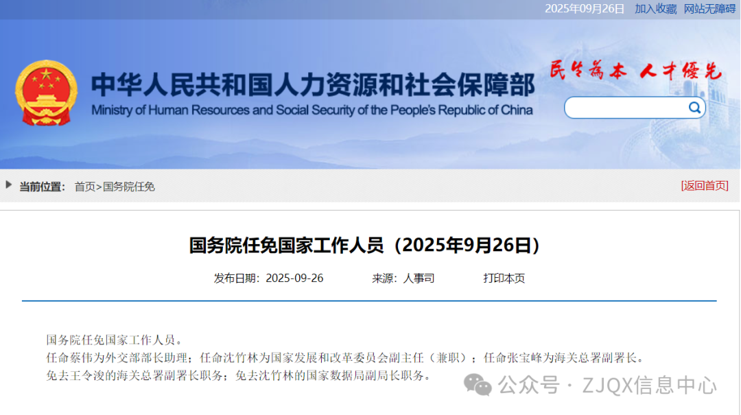 人事任免|蔡伟任外交部部长助理、沈竹林任国家发展和改革委员会副主任(兼职)、张宝峰任海关总署副署长