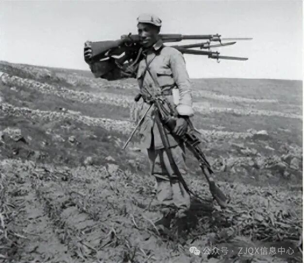 照片中的李永生就是步兵连连长,只见他手拎一挺“歪把子”机枪,肩扛三支带刺刀的“三八大盖”,皮肤黝黑,身形健硕,难掩胜利的喜悦。虽然帽子是歪的,风纪扣是敞着的,但这是战场上,更自然,更真实,更可爱!