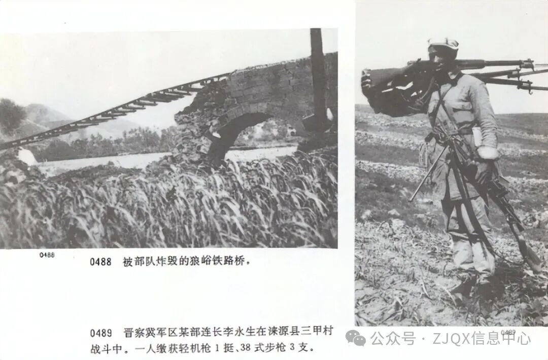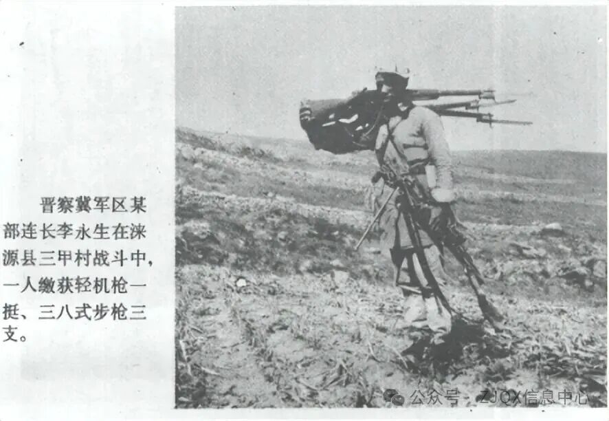 1990年解放军出版社《百团大战历史资料文献选编》,在这张照片左边的说明写道:晋察冀军区某部连长李永生在涞源县三甲村战斗中,一人缴获轻机枪一挺,三八式步枪三支。
