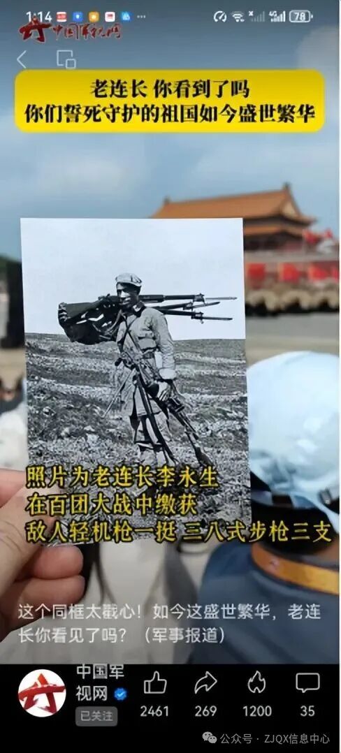 9月3日抗战胜利80周年阅兵当天,中国军视网发布一条【这个同框太戳心!如今这盛世繁华,老连长你看见了吗?】当战旗方队通过天安时,一张80多年前的老照片被悄然举起。这张照片为老连长李永生,在百团大战的三甲村战斗中,缴获敌枪数把后定格的胜利瞬间。80多年后,当代军人挺拔身姿与他身影重叠,这80年的荣光是对老连长最深情的告慰!