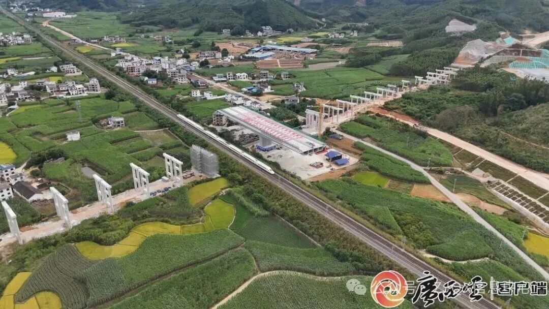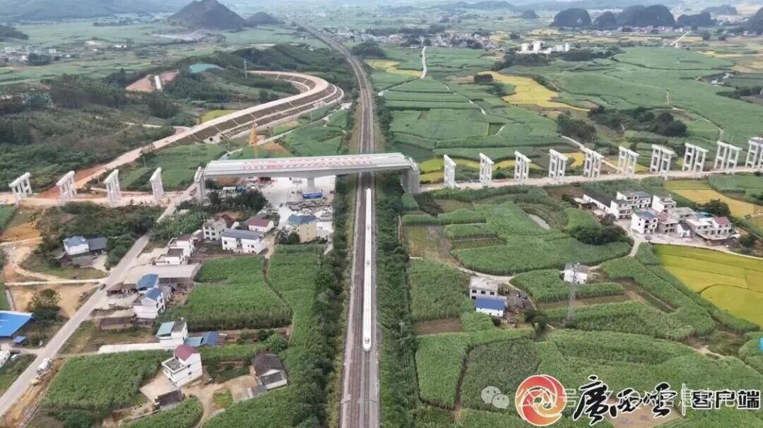 柳州高速过境线公路上跨衡柳铁路立交桥转体前,平行于衡柳铁路。