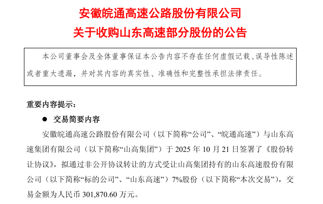 近日,皖通高速发布公告称,拟通过非公开协议转让方式,受让山东高速集团有限公司(简称“山高集团”)持有的山东高速股份有限公司(简称“山东高速”)7%的股份。本次交易涉及股份数量达3.38亿股,转让价格确定为每股8.92元,总交易金额达30.19亿元。