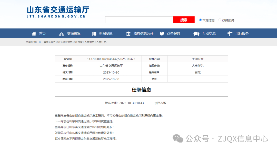 近日,山东省交通运输厅公布了一批最新人事任免信息。
