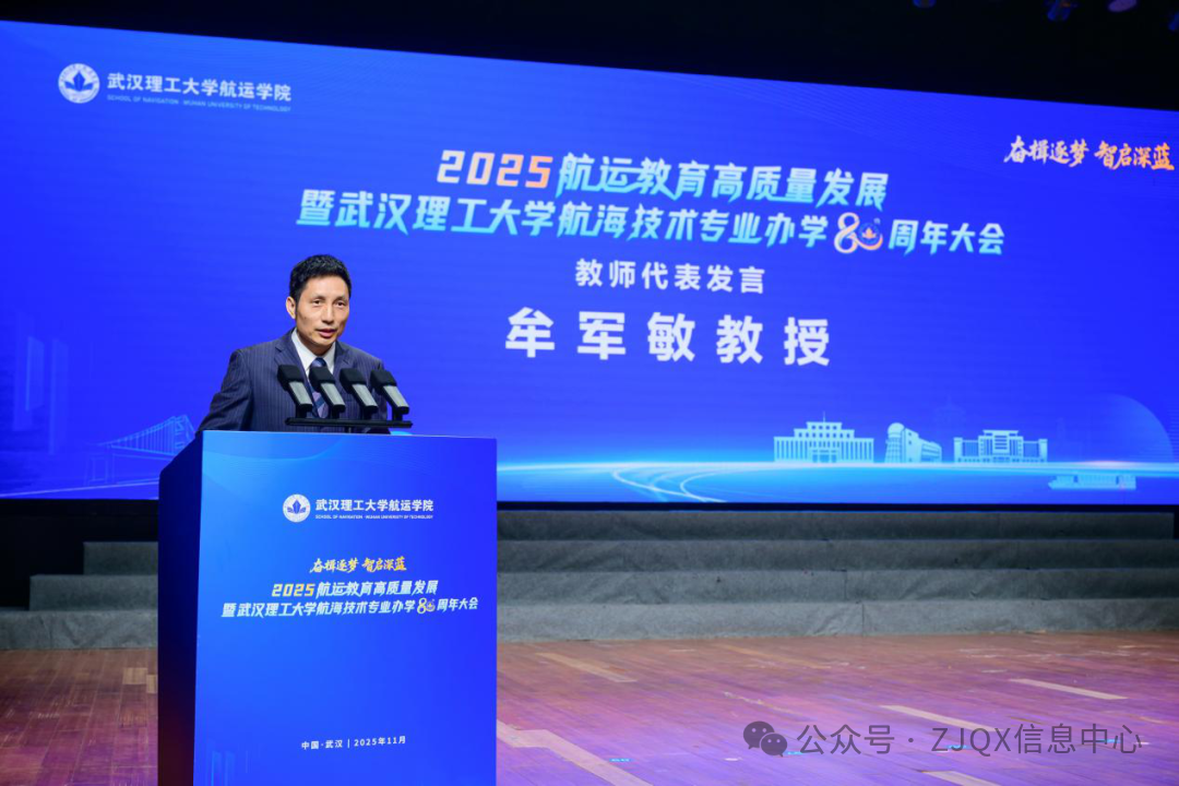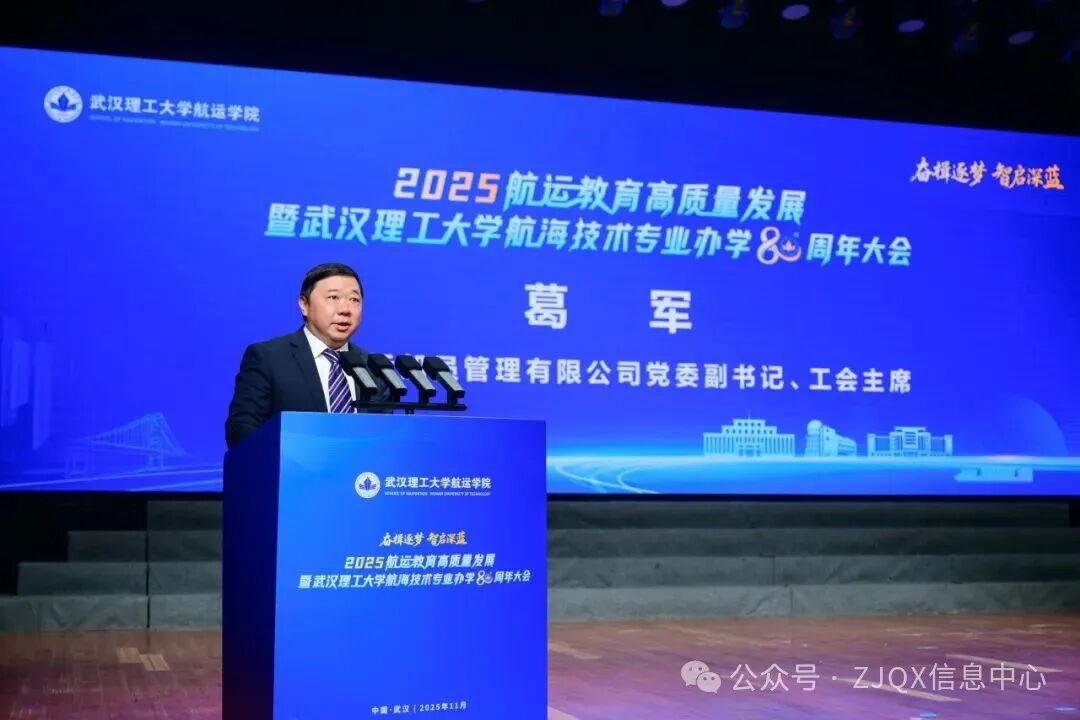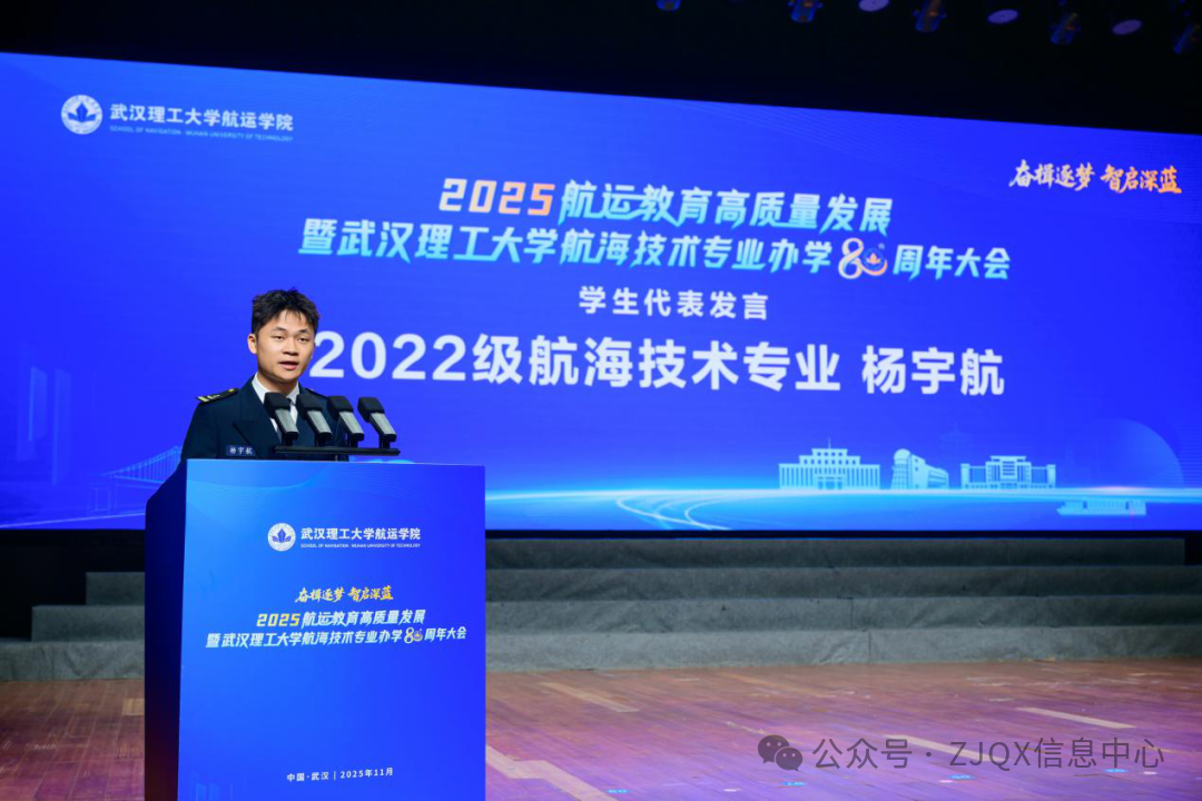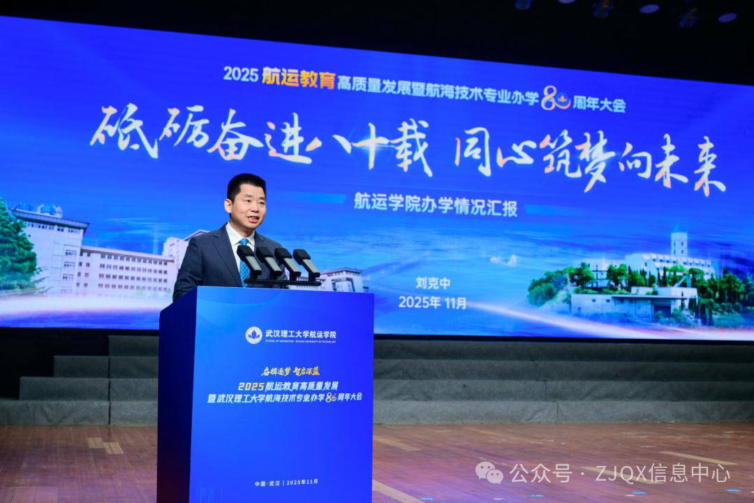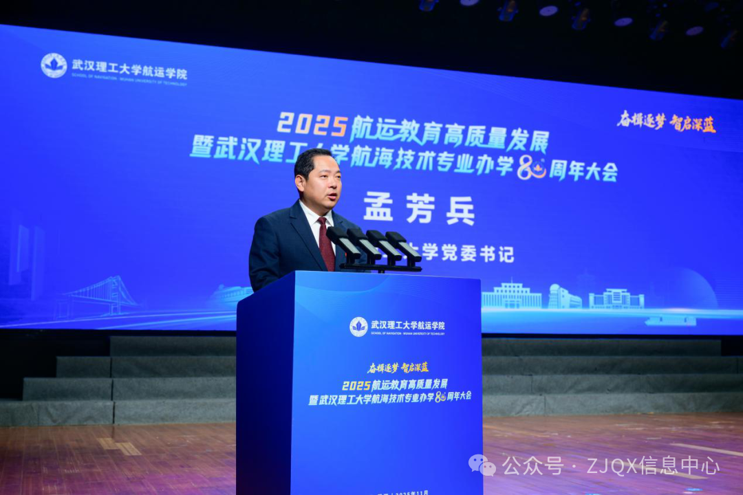 11月9日上午,航运教育高质量发展暨武汉理工大学航海技术专业办学80周年大会在湖北武汉举行,大会以“奋楫逐梦·智启深蓝”为主题。80年来,武汉理工大学航海技术专业累计培养1.6万余名优秀航运人才,为我国航运事业发展做出了重要贡献。