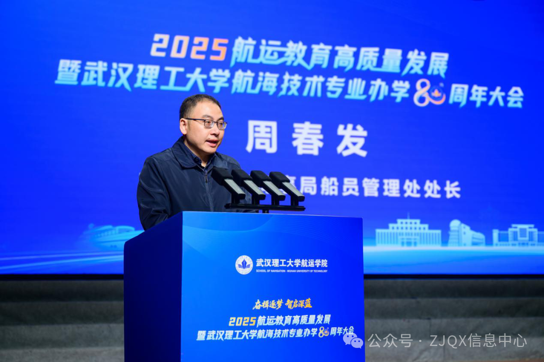 交通运输部海事局船员管理处处长周春发对航海技术专业办学80周年表示热烈祝贺,希望航运学院继续发挥学科优势,构建更加开放、融合、创新的航运人才培养体系,为加快建设交通强国、海洋强国贡献力量。