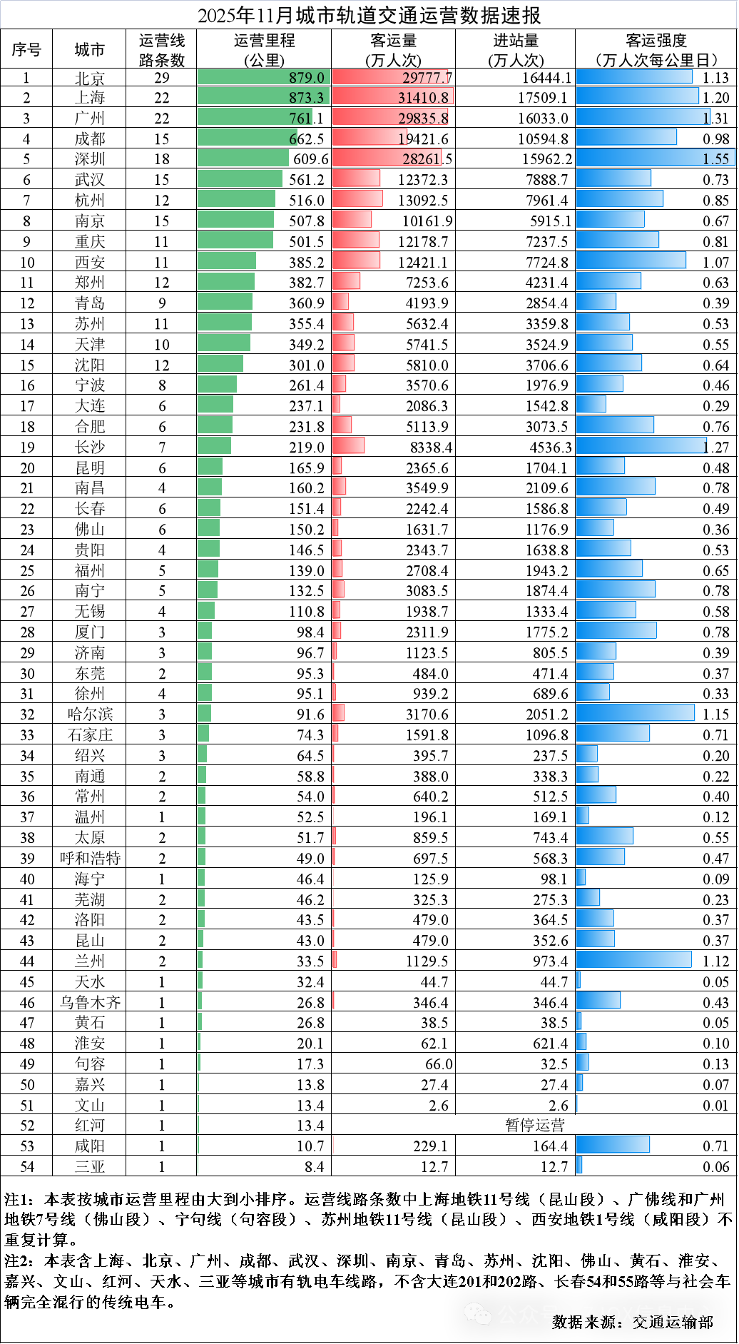 2025年11月,31个省(自治区、直辖市)和新疆生产建设兵团共有54个城市开通运营城市轨道交通线路334条,运营里程11389.7公里,实际开行列车362万列次,完成客运量28.3亿人次,进站量16.8亿人次。11月份,客运量环比增加0.1亿人次,增长0.4%,同比增加1.2亿人次,增长4.4%。11月份全国总运营里程的平均客运强度为0.832万人次每公里日,环比增长3.5%,同比降低3.3%。