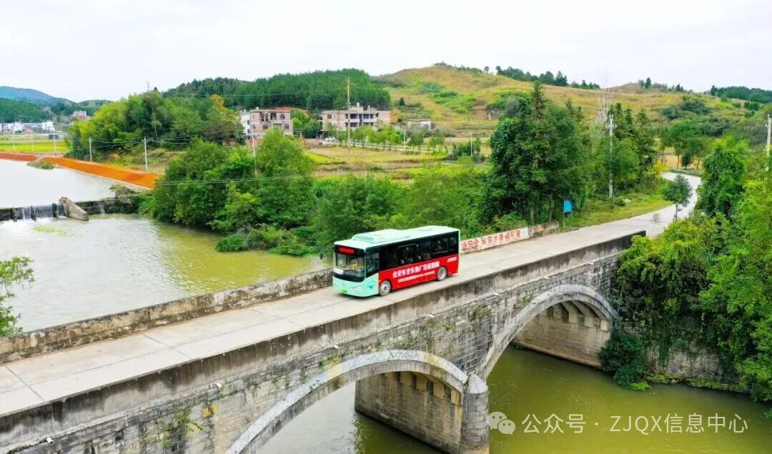 永州市新田县新圩镇长富村,一辆新能源纯电动公交车从长富桥上驶过。