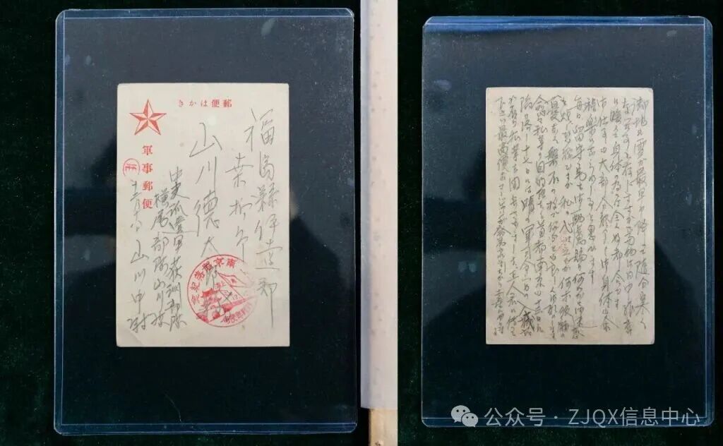 第二封由徐州高中生于聍鹏捐赠,是日军中尉“山川”于1937年12月18日寄给日本福岛县“山川德太郎”的信件,信封正面盖有“南京陷落纪念”邮戳。信中写道:“……我们的目的地,首都南京,终于在13日被我们攻占了。在17日举行了盛大的军司令官入城式,我们接受了检阅。请告诉正人君,我发现了最贵的麻将,我将作为特产送给他。”