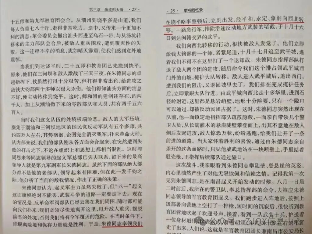《粟裕回忆录》对朱德率领南昌起义军余部进入平和的记载
