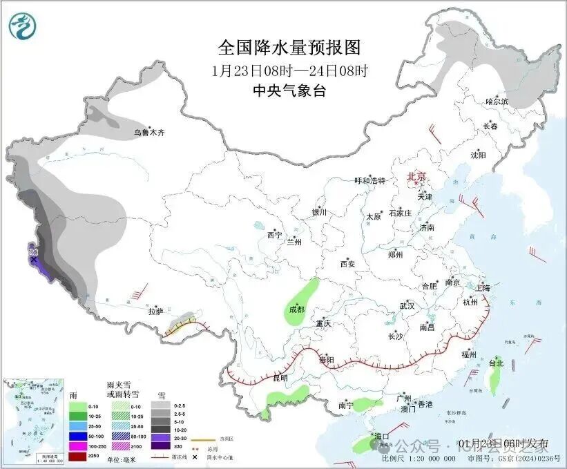 据中央气象台预计,1月23日,新疆北疆和南疆西部山区、西藏西部、内蒙古东北部、黑龙江中东部等地部分地区有小到中雪。其中,西藏西南部等地部分地区有大到暴雪,局地大暴雪。四川盆地中西部、云南东南部、广西东南部、海南岛、台湾岛等地部分地区有小雨。
