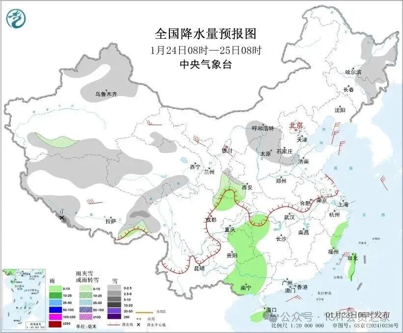 1月24日,新疆北部和南疆南部山区、西藏、内蒙古河套地区、东北地区东部、青海南部和西部、陕西北部、华北西部等地部分地区有小到中雪或雨夹雪。其中,西藏南部部分地区有大雪。陕西南部、湖北西南部、湖南西部、福建东北部、四川盆地西北部、重庆东南部、贵州东部、广西中部、海南岛、台湾岛等地部分地区有小雨,局地有中雨。