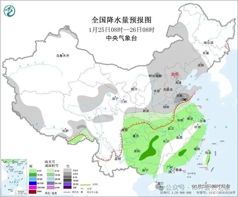 1月25日,新疆北疆北部、西藏西南部和东部、内蒙古中东部、辽宁、青海中部、陕西南部、华北、黄淮、江淮北部等地部分地区有小到中雪或雨夹雪。其中,山东南部部分地区有大雪。江淮南部、江汉、江南、西南地区东部、华南、台湾岛等地部分地区有小到中雨。